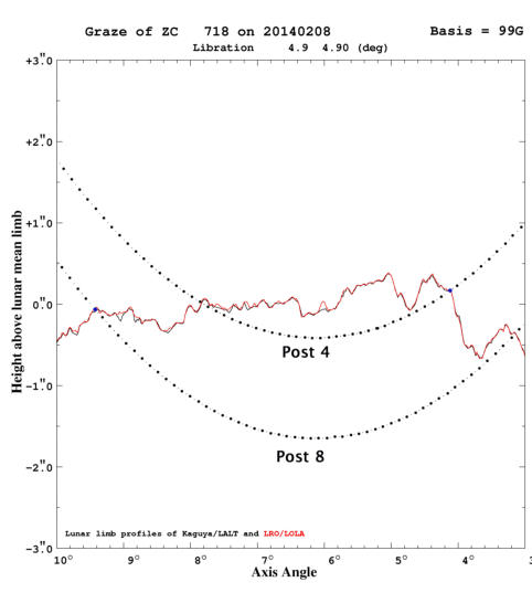 volgend de waarnemingen van Kaguya, en de rode lijn volgens de LRO (Lunar