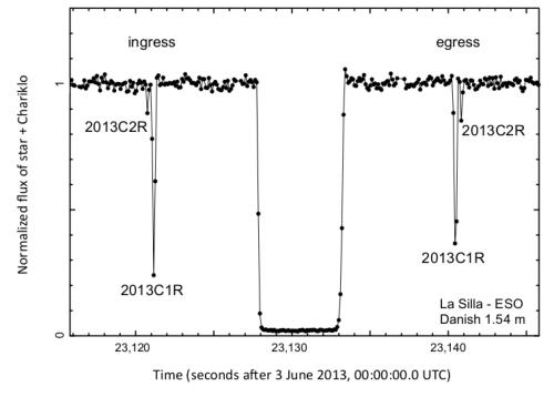 s later gaat Chariklo zelf voor de ster langs. Weer ongeveer 10 seconden